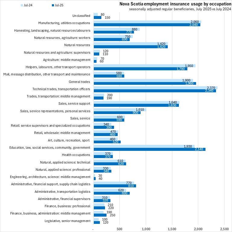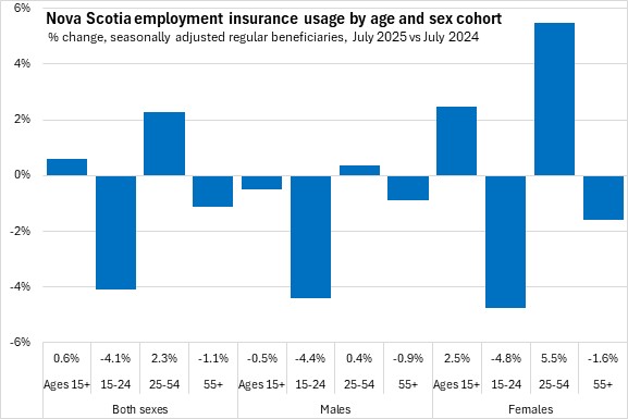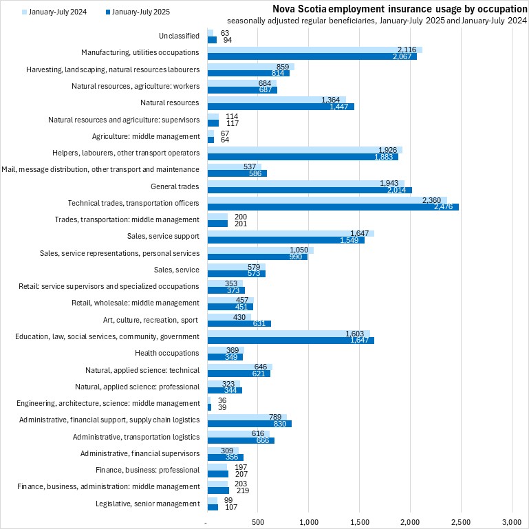 In August 2025, there were 22,540 Nova Scotians in receipt of regular employment insurance benefits (seasonally adjusted). Nova Scotia's seasonally adjusted regular employment insurance usage increased by 20 (+0.1%) from revised July results to August.