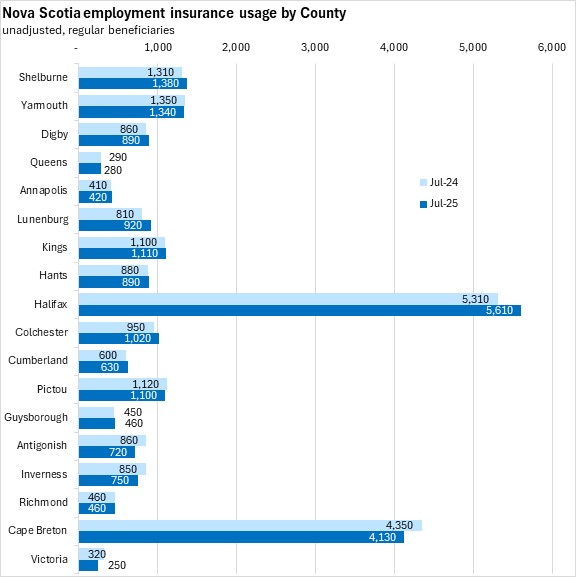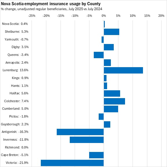 Comparing unadjusted regular beneficiaries for August 2025 against August 2024, the fastest growth in employment insurance usage was in Lunenburg county, followed by Halifax. The fastest declines were in Victoria, Antigonish, and Inverness counties. Queens and Guysborough reported no change, year-over-year.