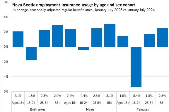 Compared to August 2024, Nova Scotia's employment insurance usage rose 0.6% (+140). National employment insurance usage increased 11.5% (+57,000) compared to August 2024. Nine provinces reported higher employment insurance compared to one year ago, with the fastest rise in Alberta and the slowest in Nova Scotia. Newfoundland and Labrador was the only provinces to report lower employment insurance usage over August 2024.