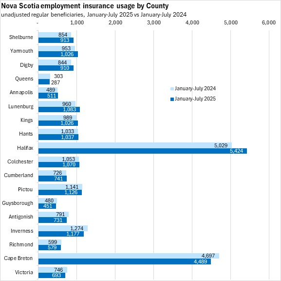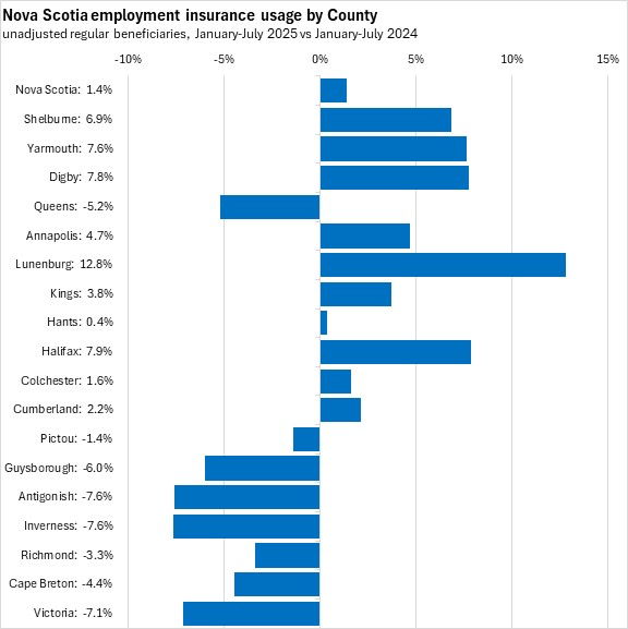 Comparing the first eight months of 2025 with the same period in 2024, employment insurance usage declined in Queens, Pictou, Guysborough, and Antigonish counties along with all four counties on Cape Breton Island. Employment insurance usage increased the most (in percentage terms) in Lunenburg, Halifax, and Digby counties.