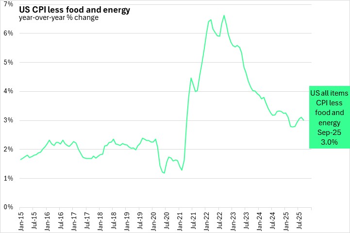 The US CPI excluding food and energy rose 3.0% compared to September 2024.