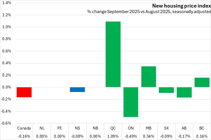 New housing prices in Nova Scotia declined 0.08% from August to September 2025. Nationally the price of new houses declined 0.16%, with four provinces reporting declines and three provinces reporting growth from the previous month. Ontario posted the largest decline and Québec posted the largest increase.
