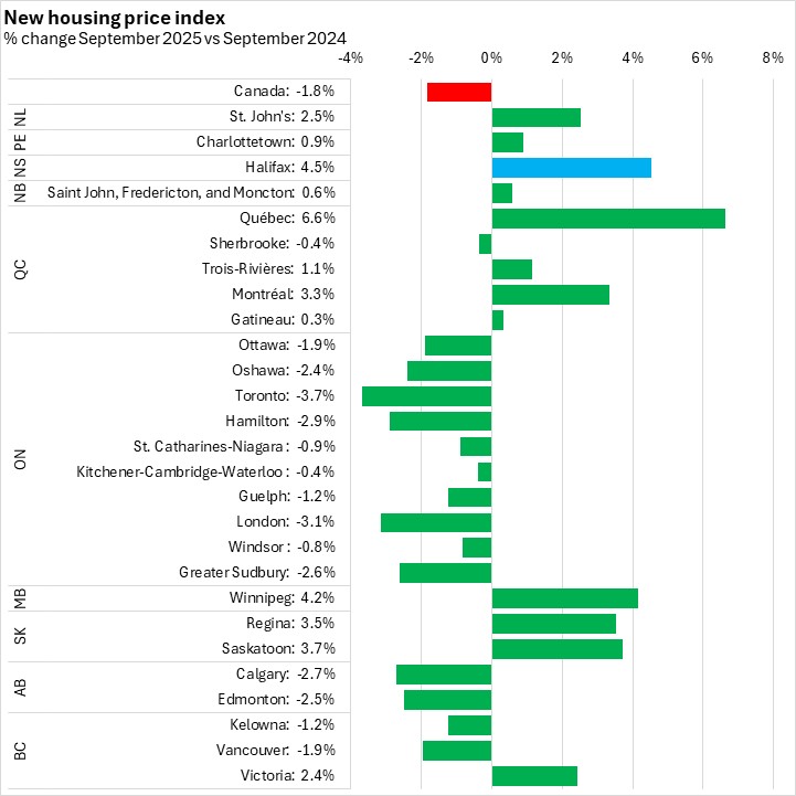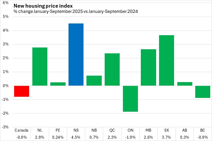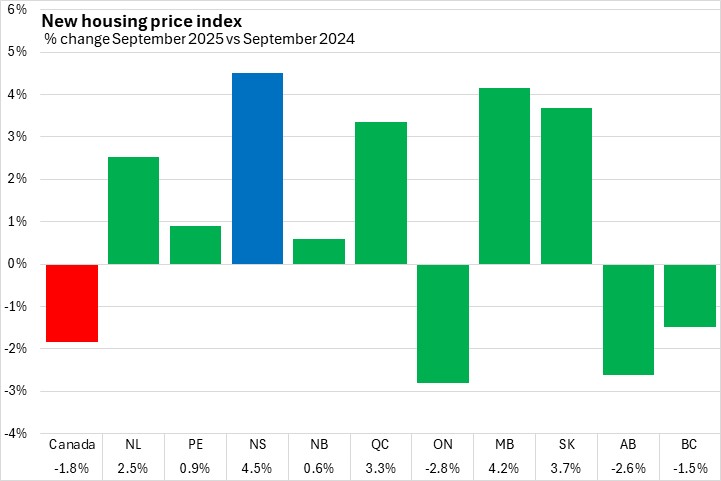 Nova Scotia’s new housing prices increased 4.5% from September 2024 to September 2025. Nationally, prices were down 1.8%.