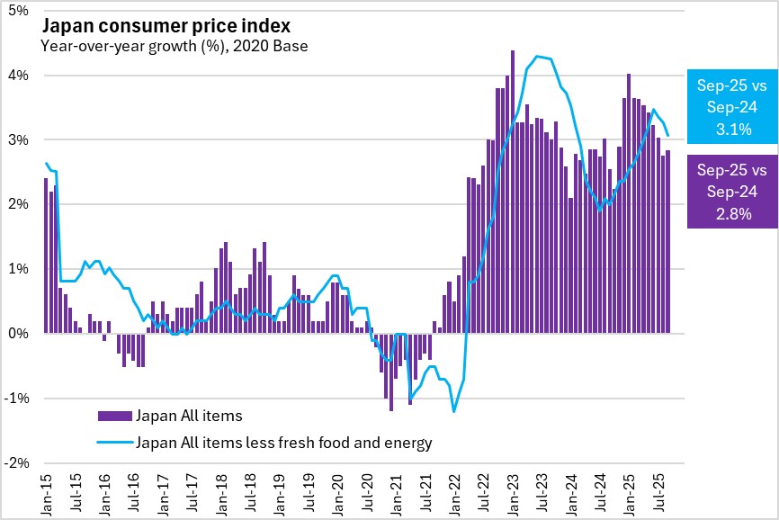 Japan’s inflation (all items, year-over-year growth in consumer price index) was 2.8% in September 2025, up from 2.7% in August. Japan's underlying inflation (all items excluding fresh food and energy) was 3.1%, down from 3.3% in the previous month.