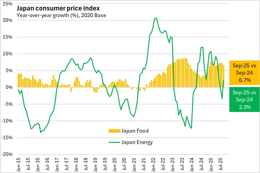 Japan's energy prices were up 2.3% in September 2025 compared with September 2024. Japan's food inflation was 6.7% over this period.
