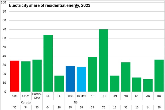 Electricity was Canada's second most common source of residential heating energy in 2023 (35%). This was notably higher in Quebec as well as in Newfoundland and Labrador. Electricity accounted for 29% of Nova Scotia's residential heating energy in 2023.