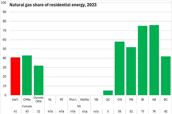 Across Canada, natural gas was the most commonly used energy source for residential heating in 2023. At 41% of residential energy, natural gas was ahead of electricity (35%). However, use of natural gas was primarily in Ontario and the western provinces. Natural gas made up only a small share of residential heating energy in Quebec and the Atlantic provinces. Data on Nova Scotia use of natural gas was unavailable.