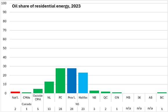 Although wood was a less commonly-reported source of residential heating energy (2% of the national total), it was more widely used in Atlantic Canada. Including solid wood as well as pellets, 6% of Nova Scotia's residential heating energy was fuelled by wood.