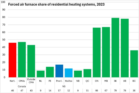 The forced air furnace was the most common appliance used to generate residential heating across Canada. Forced air furnaces made up 46% of residential heating equipment in Canada with notably higher shares in Ontario and Western Canada. Forced air furnaces were used in 17% of Nova Scotia residences in 2023 and were less commonly used across Quebec and the rest of Atlantic Canada.