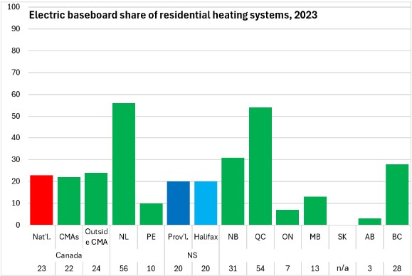Electric baseboard heaters amounted to 23% of Canada's residential heating equipment. The share of electric baseboard heaters was higher in Quebec and Newfoundland and Labrador. In Nova Scotia 20% of residences used electric baseboard heaters.