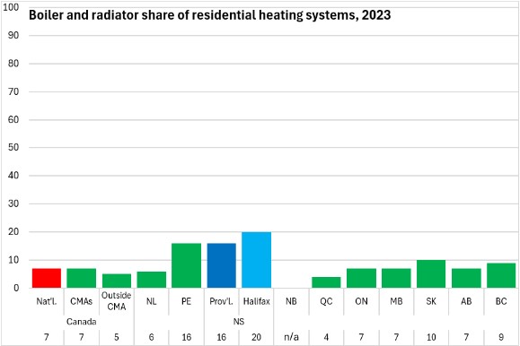 Boilers with water or steam radiators were used in only 7% of Canadian residences, but this was higher in both Nova Scotia (16%) and Prince Edward Island (16%).