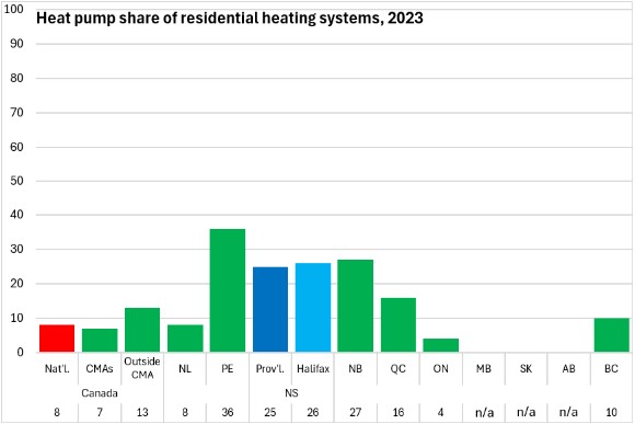In Nova Scotia, 25% of residences used a heat pump as the primary energy equipment. Heat pumps were also more widely used in the Maritime provinces than across the rest of Canada (8% share nationally).