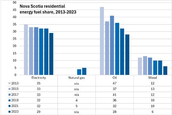Since 2013, there has been a notable decline in the shares of residential heating provided by wood, oil and electricity. Data are unavailable on use of natural gas or other heating fuels in Nova Scotia.