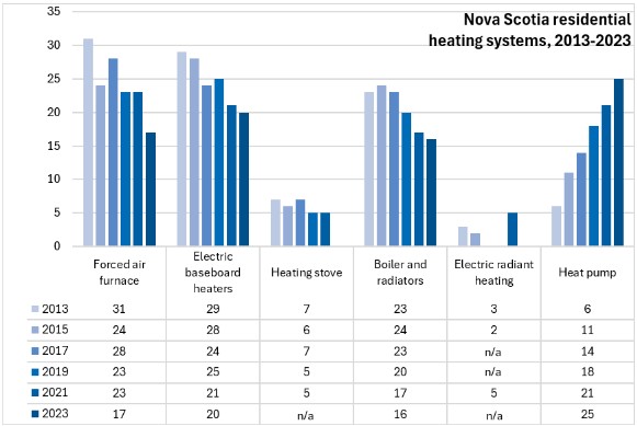 Since 2013, there has been a substantial rise in the share of residences equipped with a heat pump in Nova Scotia. There have been declines in the use of forced air furnaces, electric baseboard heaters and boilers/radiators. As of 2023, the share of residences using heat pumps (25%) rose above that of electric baseboards (20%), forced air furnaces (17%) and boilers/radiators (16%). Data on the use of heating stoves and electric radiant heating were unavailable for Nova Scotia in 2023.
