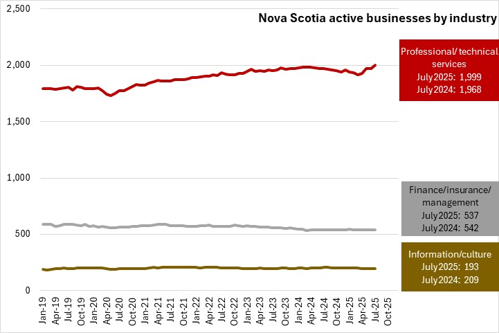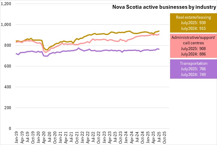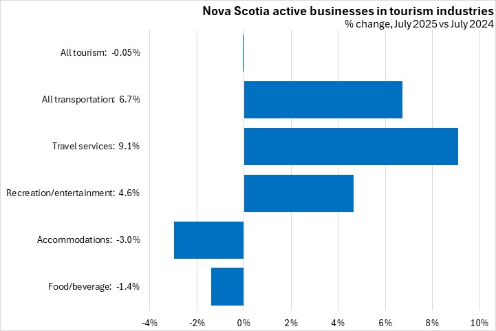 Statistics Canada has broken out specific data for tourism-related industries. Compared with July 2024, the number of active tourism-related businesses edged down 0.05% in Nova Scotia as of July 2025, with gains in all subsectors except accommodations and food/beverage.