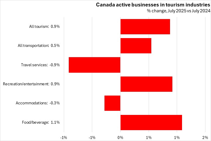 Nationally the number of tourism-related businesses edged up 0.9% from July 2024 to July 2025. All sectors reported growth in active businesses except accommodations and travel services.