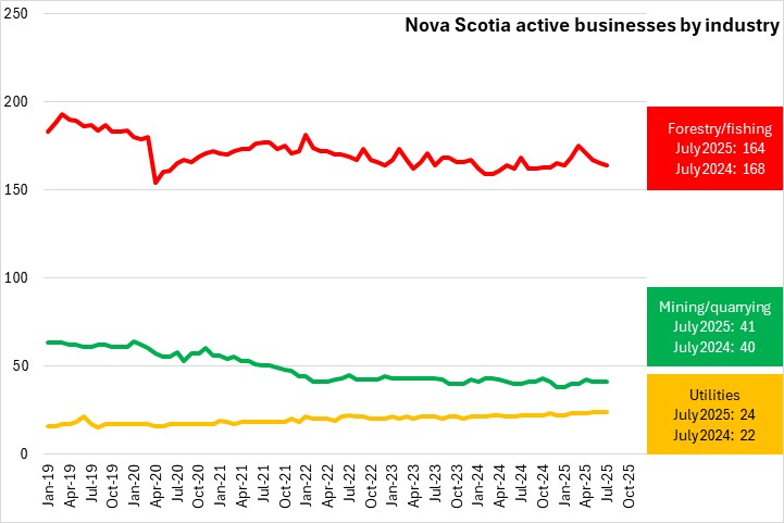 There has been a downward trend in forestry/fishing active businesses, but in the three months prior to April there was a substantial rise in active businesses. Active businesses in forestry/fishing declined starting in April and up to July from their recent peak in March 2025. Mining/quarrying has been steadily declining, but stabilized in the spring of 2025. Utilities have been slowly growing.