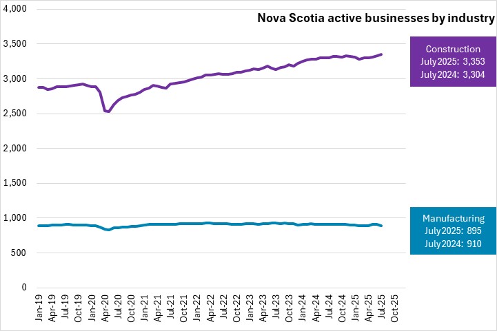 The number of active businesses in Nova Scotia edged down by 0.08% from June 2025 to July 2025, falling by 17 to 21,082 active businesses.