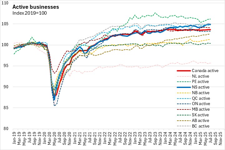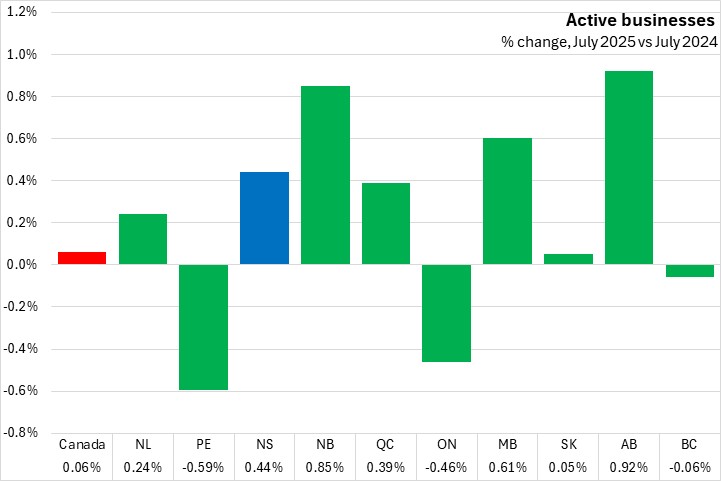 Compared with July 2024, the number of active businesses was up 0.44% for Nova Scotia. Nationally, active businesses were up 0.06% compared to July 2024. Alberta reported the largest increase in active businesses and Prince Edward Island reported the largest year-over-year percentage decline in active businesses.