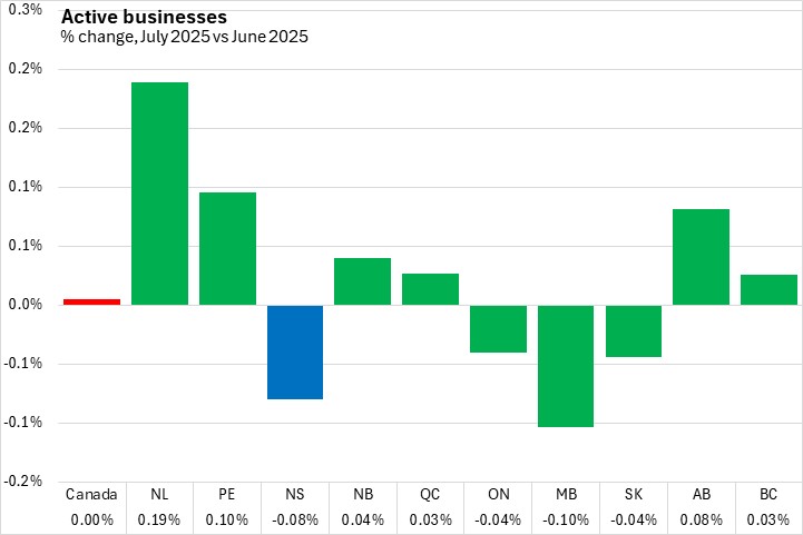 Nationally, active businesses were unchanged, despite gains in six provinces. Newfoundland and Labrador posted the fastest gain, while Manitoba reported the largest decline in active businesses.