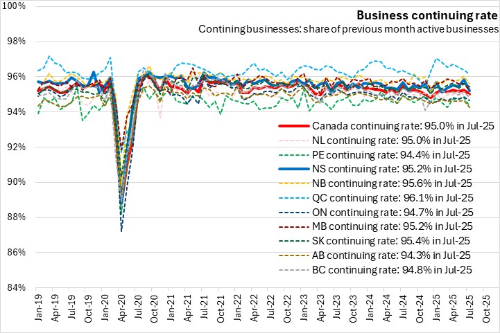 Most businesses continue operating each month. In July 2025, Nova Scotia's business continuing rate was 95.2%, slightly above the national average (95.0%). Québec reported the highest business continuing rate (96.1%) while Alberta reported the lowest continuing rate (94.3%).