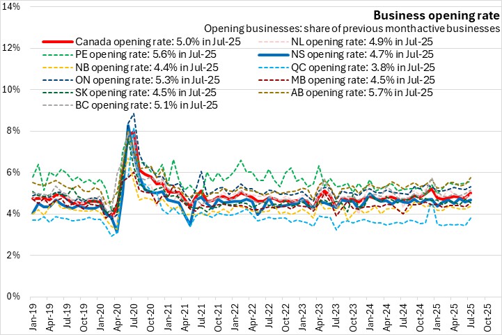 Nova Scotia's business opening rate was 4.7% in July 2025, below the national average of 5.0%. Alberta had the highest business opening rate (5.7%) while Québec had the lowest (3.8%).