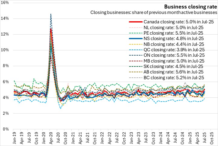 Nova Scotia's business closing rate was 4.8% in July 2025, below the national average of 5.0%. Alberta reported the highest business closing rate (5.6%), while Québec had the lowest business closing rate (3.9%).