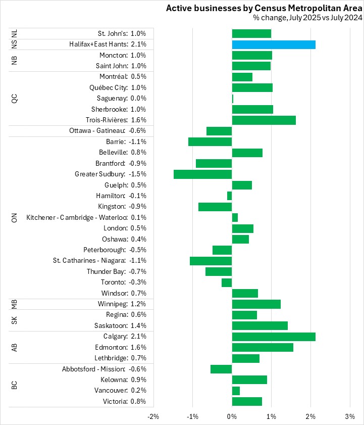 The number of active businesses in the Halifax and East Hants Census Metropolitan Area was up 2.1% from July 2024 to July 2025.
