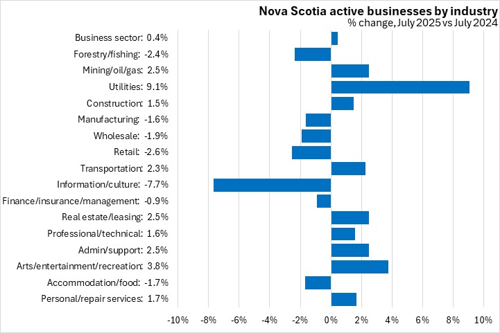 Compared with July 2024, nine sectors saw an increase in active businesses in Nova Scotia in July 2025 with the largest percentage increase in utilities. The steepest decline was in information/culture services.