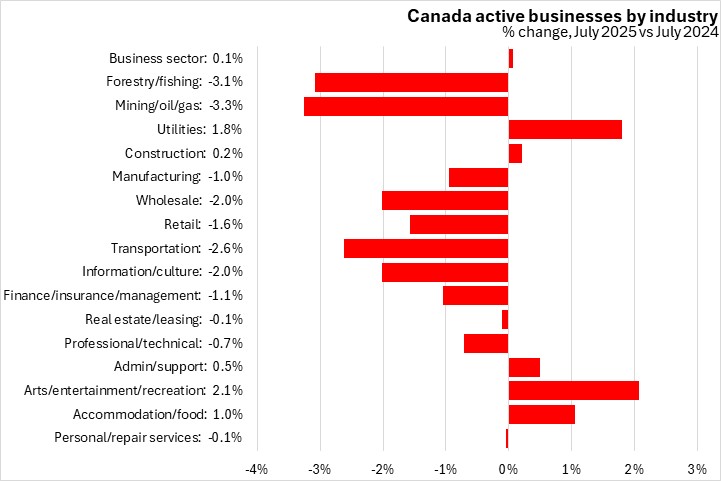 Nationally, the number of active businesses was down for eleven of sixteen business sectors. The largest gain was in arts/entertainment/recreation, while the largest declines were in mining/oil/gas and forestry/fishing.