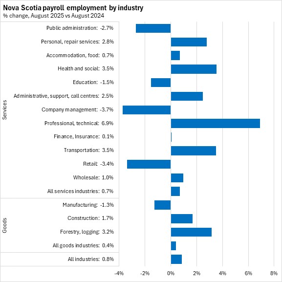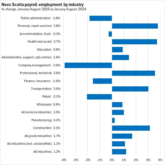 Personal/repair services, health care/social assistance, and professional/technical reported the fastest growth in payroll employment in the first eight months of 2025 in Nova Scotia. The fastest declines were reported in company management and retail trade.