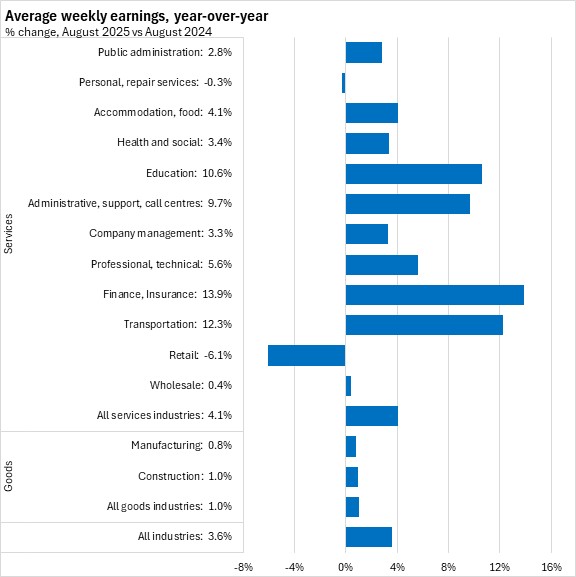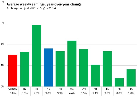 Average weekly wages grew by 3.6% in Nova Scotia from August 2024 to August 2025. This was stronger than the national pace of 3.0%.