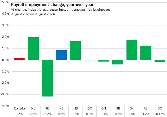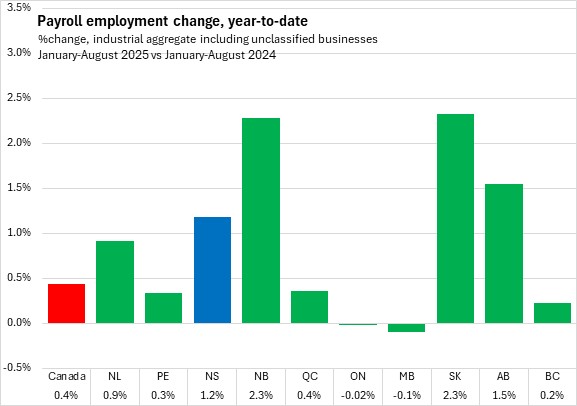 In the first eight months of 2025, Nova Scotia's payroll employment increased 1.2%. This was faster than the national average of 0.4% as all provinces reported growth except Ontario and Manitoba. The fastest year-to-date growth was reported in Saskatchewan and New Brunswick.