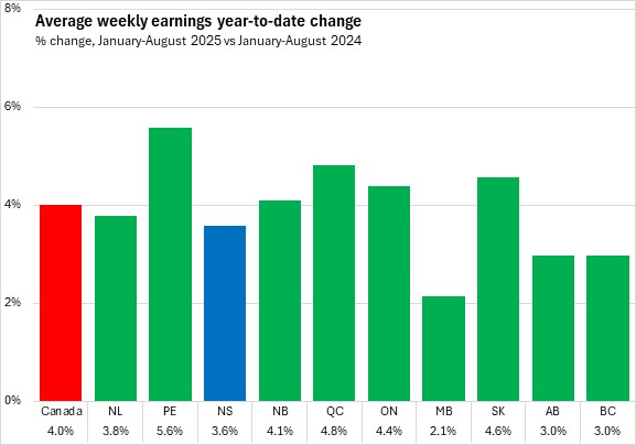 In January-August 2025, average weekly earnings grew 3.6% in Nova Scotia compared to the same period last year. National average weekly earnings grew 4.0% with all provinces reporting growth over this period. Prince Edward Island reported the fastest growth while Manitoba reported the slowest.
