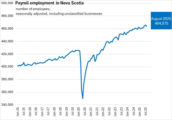 Nova Scotia had 464,075 payroll employees in August 2025, down 0.40% (-1,855) compared to July 2025. Canada had 18.27 million employees, up 0.02% from July 2025 despite declines in six provinces. The fastest decline was reported in Prince Edward Island while the fastest gain was in Ontario.