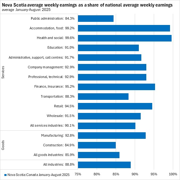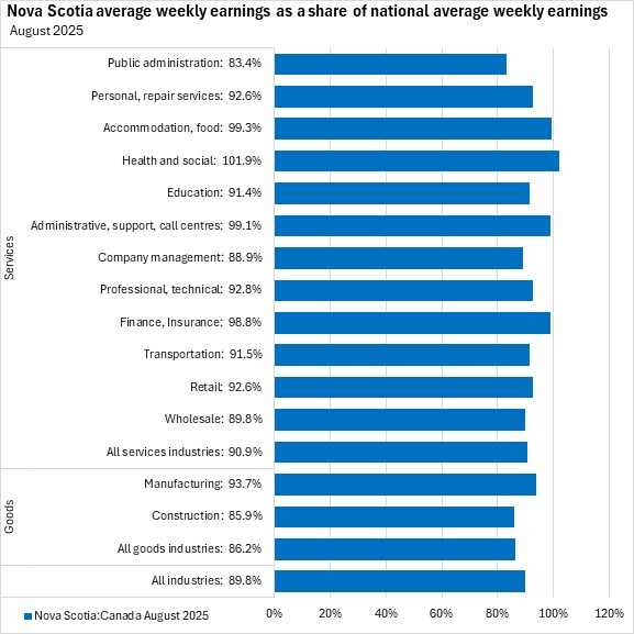 In August 2025, Nova Scotia's average weekly wages were 89.8% of the national average. Nova Scotia average weekly wages were below the comparable national average for every industry except health/social assistance. The smallest gaps were reported among accommodations/food services, and administrative/support/call centres. The largest gap was reported in public administration (83.4% of the national average).