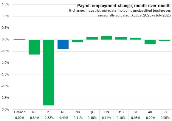 (Note: data are not available for Nova Scotia's utilities and mining sectors, and were not available from January 2025 to August 2025 for: information/culture, real estate/rental/leasing, and arts/entertainment/recreation.)