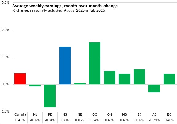 Nova Scotians' average weekly earnings were $1,177.64 in August 2025, a gain of $16.15 (+1.39%) from July 2025, the second fastest gain among provinces.