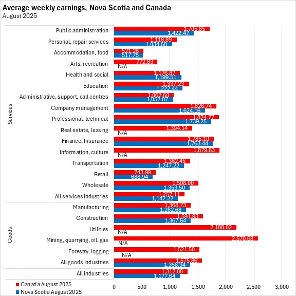 Nova Scotia's average weekly earnings in August 2025 were second lowest among provinces, ahead of Prince Edward Island. Alberta reported the highest average weekly earnings.