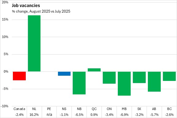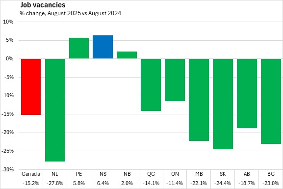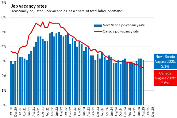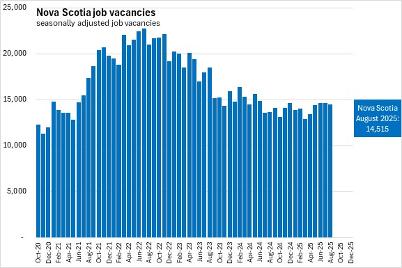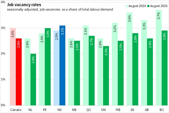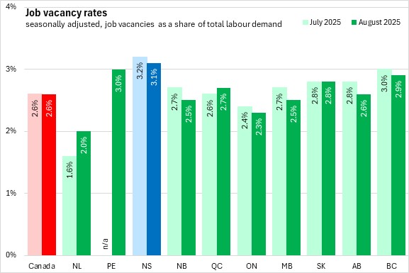 Nova Scotia had 14,515 job vacancies in August 2025 with a vacancy rate of 3.1%, down from 3.2% in July and the highest among provinces.