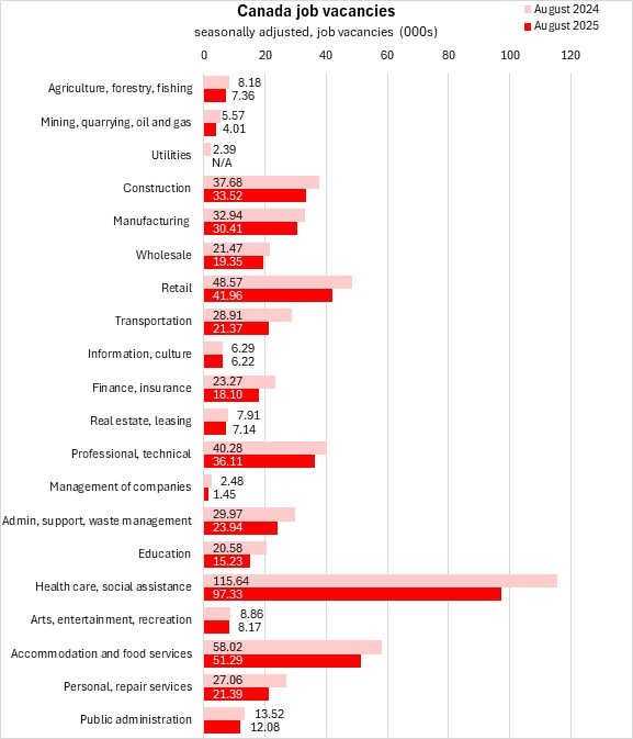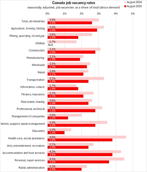 Canada job vacancy rate and job vacancies by industry, August 2025