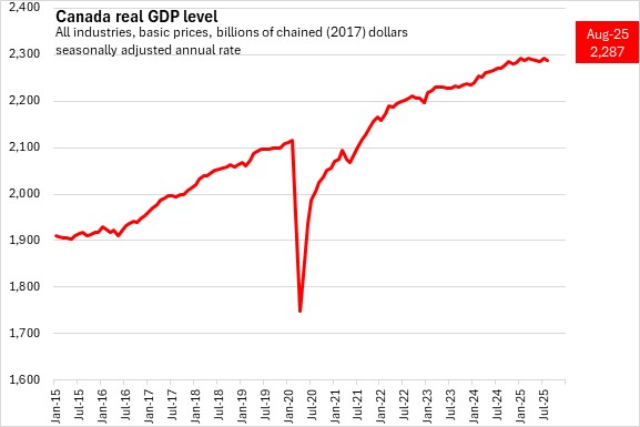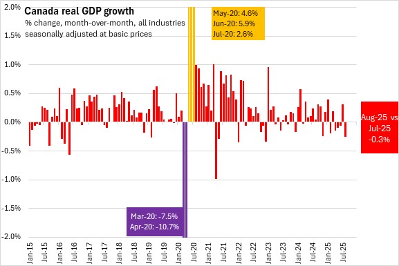 Real Gross Domestic Product (GDP) in Canada fell by 0.3% in August 2025, with declines in both goods and services producing industries.
