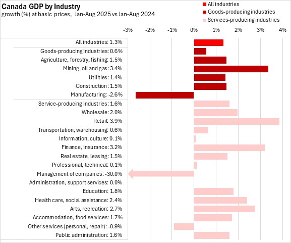 The Canadian economy was 1.3% larger in January-August 2025 when compared to the same months in 2024.