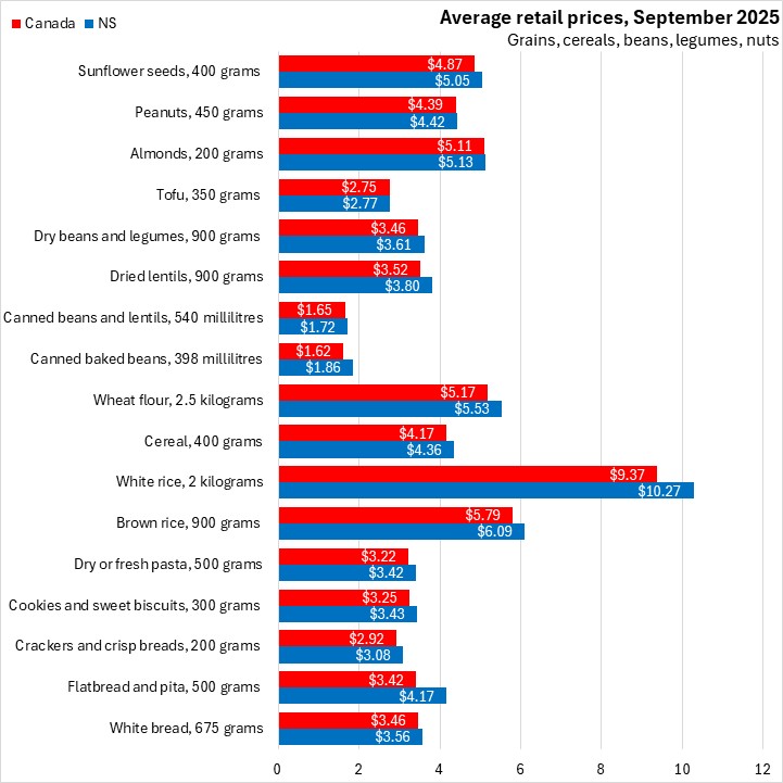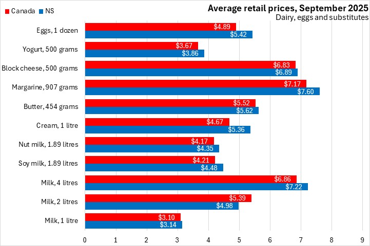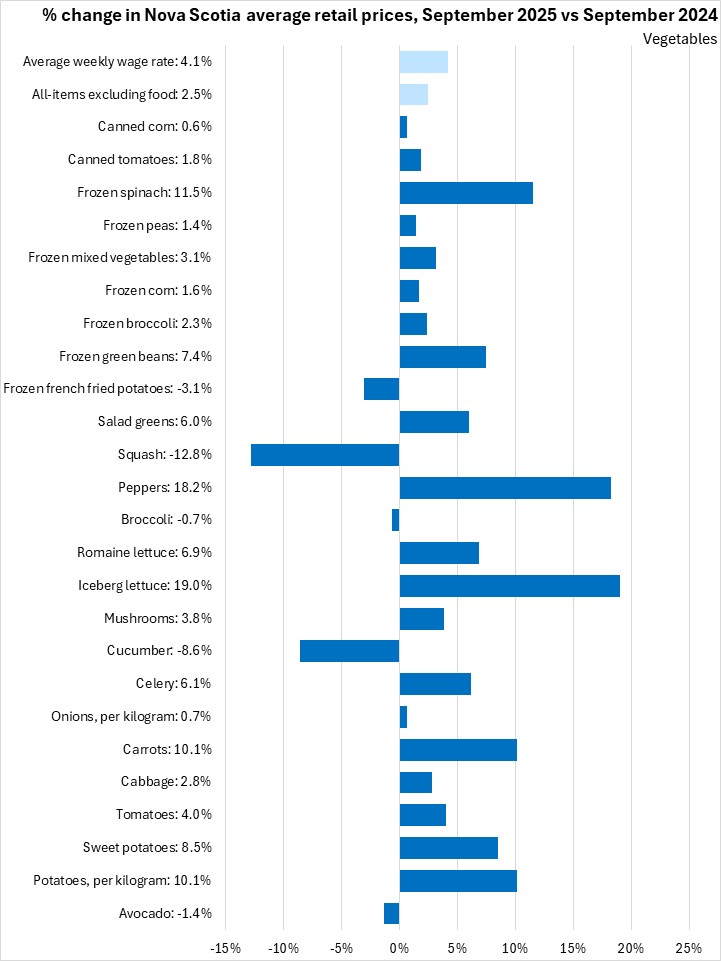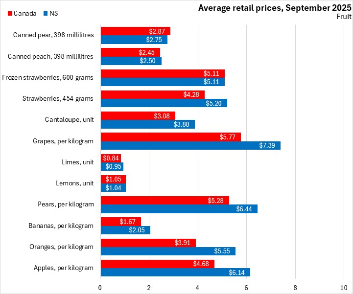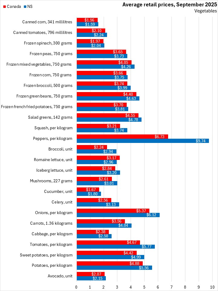 Nova Scotia food prices were more than 10% higher than the national averages for the following products: beef rib cuts, chicken drumsticks, canned tuna, cream, eggs, apples, oranges, per kilogram, bananas, pears, limes, grapes, cantaloupe, strawberries, potatoes, sweet potatoes, tomatoes, carrots, onions, per kilogram, celery, mushrooms, iceberg lettuce, broccoli, peppers, squash, flatbread and pita, tea (20 bags), vegetable oil, canola oil, olive oil, canned baked beans, canned soup.