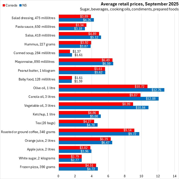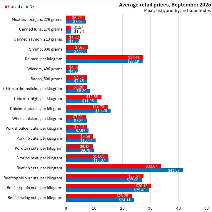 Nova Scotia food prices were below national averages for the following products: beef striploin, beef top sirloin, chicken thigh, wieners, salmon, shrimp, canned salmon, milk, 2 litres, lemons, romaine lettuce, white sugar, baby food, canned pear, hummus, pasta sauce.
