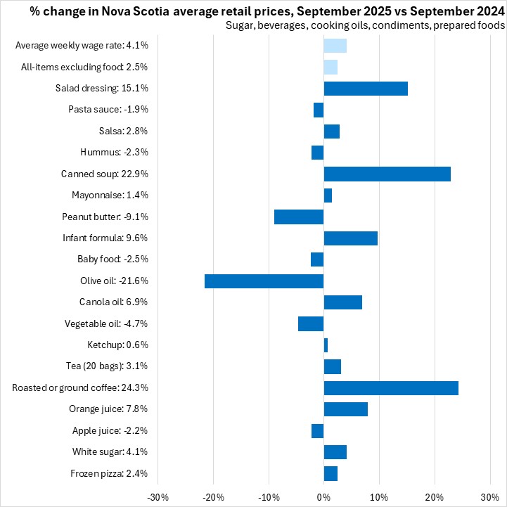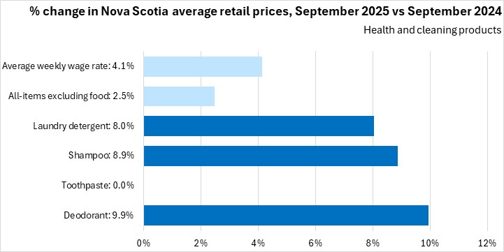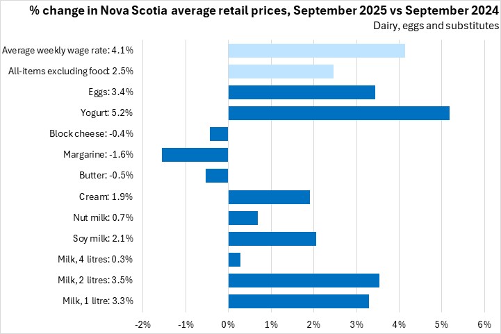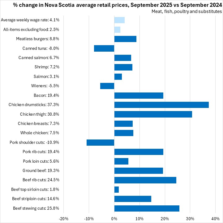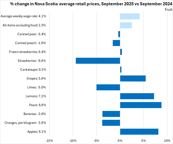 Over the last year (September 2025 vs September 2024), the consumer price index for all items in Nova Scotia excluding food increased by 2.5%. Food prices as a whole rose 4.1%. At the same time average weekly earnings across all Nova Scotia industries increased by 4.1%.