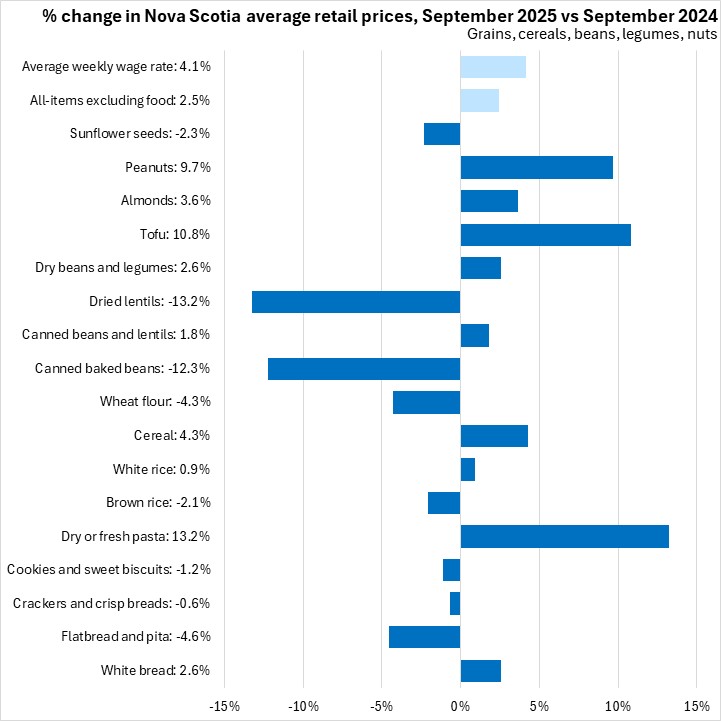 In the last year, the following products reported lower prices in Nova Scotia: pork shoulder cuts, wieners, canned tuna, butter, margarine, block cheese, oranges, bananas, limes, strawberries, avocado, cucumber, broccoli, squash, frozen french fried potatoes, flatbread and pita, crackers and crisp breads, cookies and sweet biscuits, brown rice, wheat flour, apple juice, vegetable oil, olive oil, baby food, peanut butter, canned baked beans, canned peach, canned pear, dried lentils, hummus, pasta sauce, sunflower seeds.