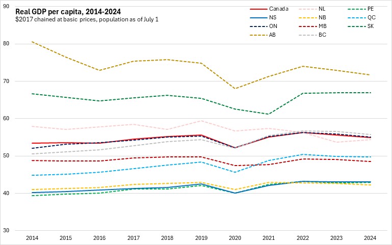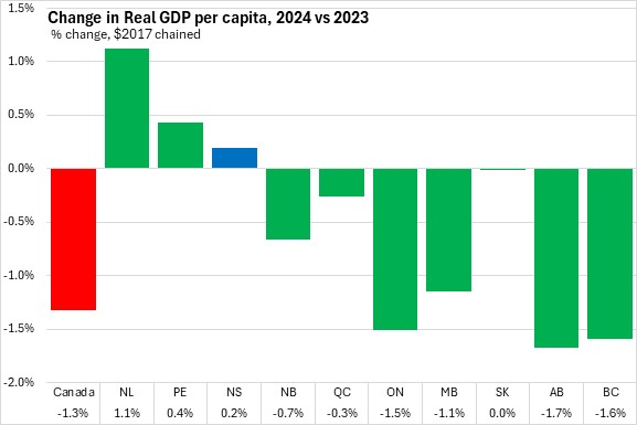 With real GDP growth outpacing population gains, Nova Scotia's real GDP per capita grew 0.2% in 2024. Three provinces reported growth in real GDP per capita. Nationally, population gains outpaced real GDP per capita growth resulting in a 1.3% decline in real GDP per capita. The steepest declines in real GDP per capita were in Alberta.