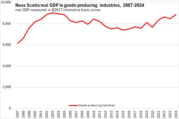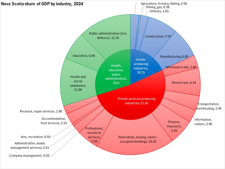 In 2024, goods production accounted for 18% of Nova Scotia's GDP while largely-private service producing industries accounted for just over 51% of Nova Scotia's GDP. Largely-public services (health, education, public administration) accounted just under 30% of Nova Scotia's GDP.