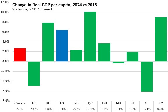 Over the last 10 years, Nova Scotia's real GDP per capita has increased by 6.4% - faster than the national average. Québec reported the fastest growth in real GDP per capita from 2015-2024, followed by British Columbia. Three provinces reported declining real GDP per capita from 2015-2024, led by Alberta and Newfoundland and Labrador.